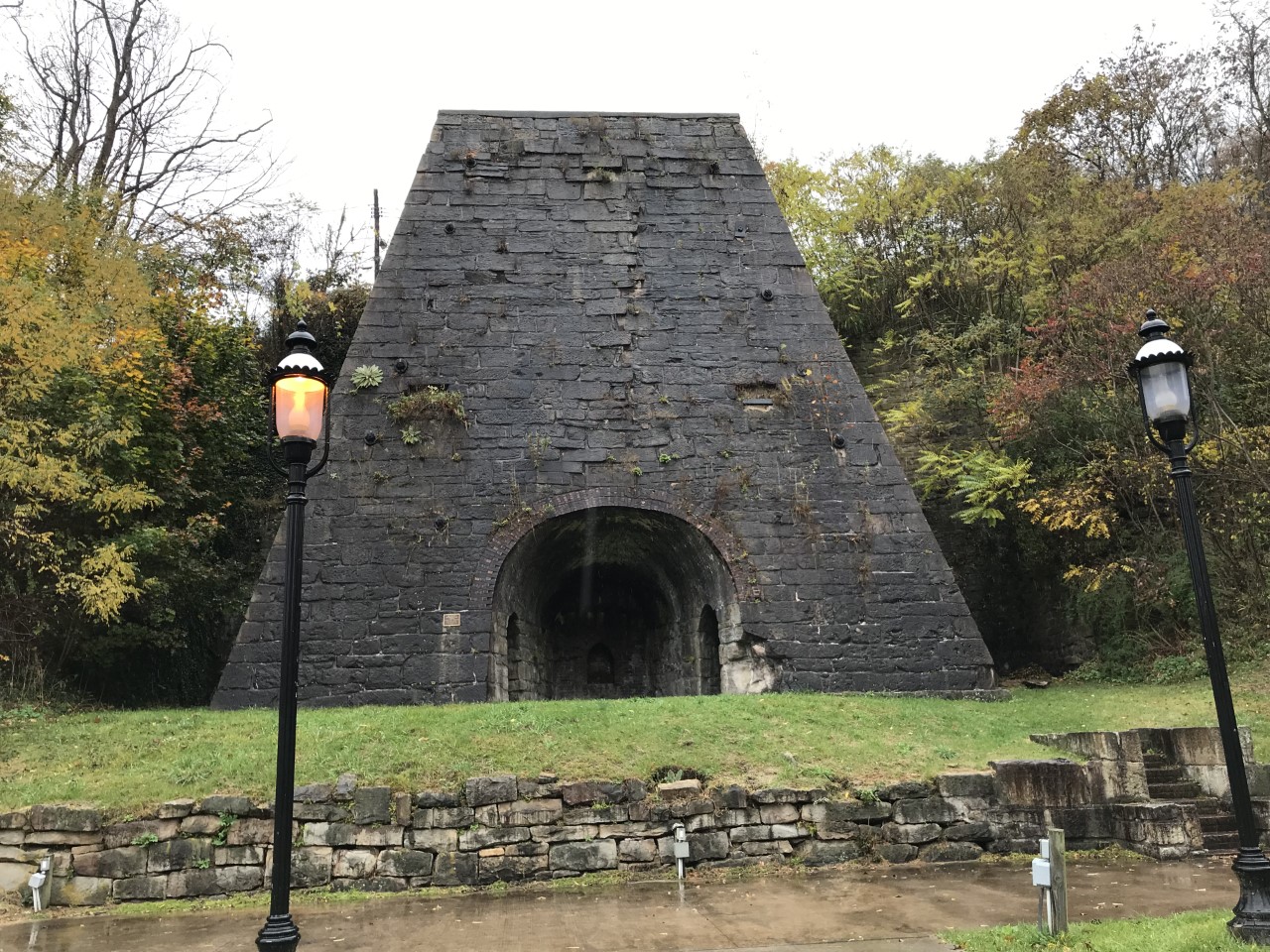 By the time we got to the entrance for Dan’s Rock, the rain and especially the fog had descended upon the state park. It is supposed to be one of the most iconic overlooks in the county and view of the Allegheny Front, but not today. We will have to leave that to another day. However, we headed further south to Lonaconing to check out the iron furnace. Lonaconing Furnace, The George’s Creek Coal and Iron Company Furnace No. 1, built in 1839 is listed on the National Register of Historic Places. It stands 50 feet high and known as the first coke furnace in the country. It sits in a little non-descript park in the center of the small town. You would likely miss it if you were just driving by. Another engineering marvel that still stands intact nearly 180 years later.