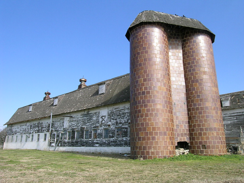 - The dairy barn at Mulberry Hill Farm. The silos are covered in tile. The main house was restored and moved at some point to Easton.