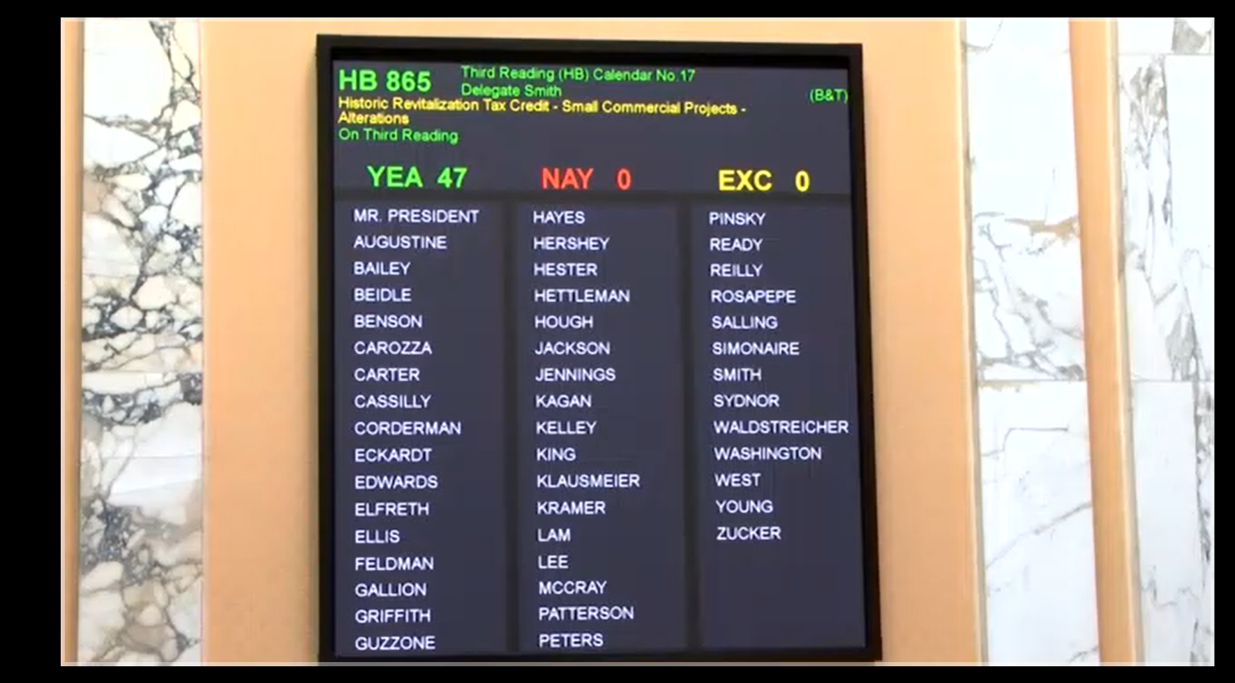 Thanks to legislation sponsored by Delegate Stephanie Smith (Baltimore City) and Senator Guy Guzzone (Howard County), the life of the program has been extended by increasing the authorization for the Small Commercial Historic Tax Credit Program by an additional $1M. While this amount does not come close to addressing the present need of shovel-ready projects across the state, it will help keep the program active.