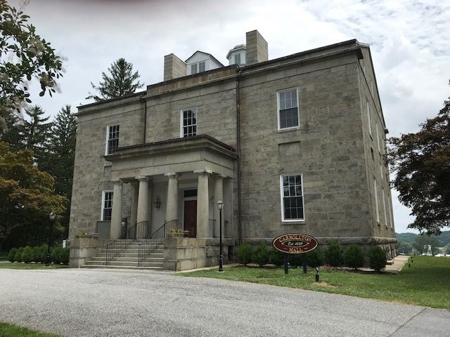 Carrollton Hall was buit by Charles Carroll of Carrollton for his granddaughter, Emily McTavish, in 1832. It was designed by William F. Small, who had apprenticed with Benjamin Latrobe. Constructed of granite ashlar (much like the stone in Latrobe’s basilica in Baltimore) in the Greek Revival style, the house has impressive identical porticos supported by Doric columns on both the front and rear sides. The house is now owned by the Franciscan Fathers.